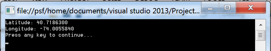 At this point, the app is ready to run but by default it will exit the console session immediately. To make sure the output is visible, let's update the code to print the results returned from Google's Geocoding service and wait for input before terminating.