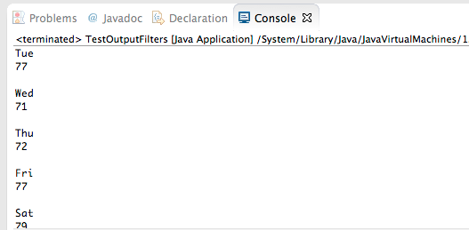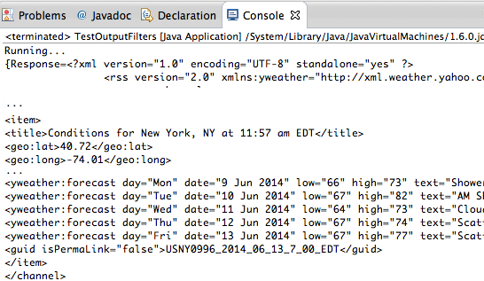 getWeatherByAddressInputs.addOutputFilter("day", "/rss/channel/item/yweather:forecast/@day", "Response"); getWeatherByAddressInputs.addOutputFilter("high", "/rss/channel/item/yweather:forecast/@high", "Response");