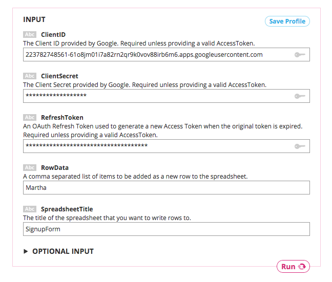 18Go to the Google > Spreadsheets > AppendRow Choreo. Select JavaScript from the drop down menu at the top of the page and plug in the required inputs into the proper fields as shown in the screenshot below: