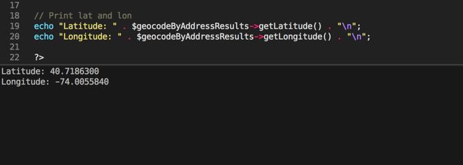 // Print lat and lon echo "Latitude: " . $geocodeByAddressResults->getLatitude() . "\n"; echo "Longitude: " . $geocodeByAddressResults->getLongitude() . "\n";