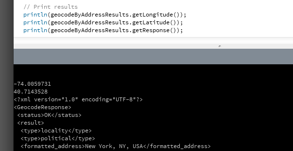 import com.temboo.core.*; import com.temboo.Library.Google.Geocoding.*; // Create a session using your Temboo account application details TembooSession session = new TembooSession("ACCOUNT_NAME", "APP_NAME", "APP_KEY"); // Set up some global variables String location = "New York, NY"; float latitude, longitude; void setup() { // Run the GeocodeByAddress Choreo function runGeocodeByAddressChoreo(); } void runGeocodeByAddressChoreo() { // Create the Choreo object using your Temboo session GeocodeByAddress geocodeByAddressChoreo = new GeocodeByAddress(session); // Set inputs geocodeByAddressChoreo.setAddress(location); // Run the Choreo and store the results GeocodeByAddressResultSet geocodeByAddressResults = geocodeByAddressChoreo.run(); // Save latitude and longitude as floats latitude = float(geocodeByAddressResults.getLatitude()); longitude = float(geocodeByAddressResults.getLongitude()); // Print latitude and longitude println("location: " + location); println("latitude: " + latitude); println("longitude: " + longitude); }