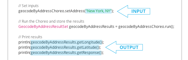 Usually you'll want to use a Choreo's inputs and outputs other places in your Sketch. You can do this easily by assigning global variables to the inputs and outputs – they're called out in the sample code below: